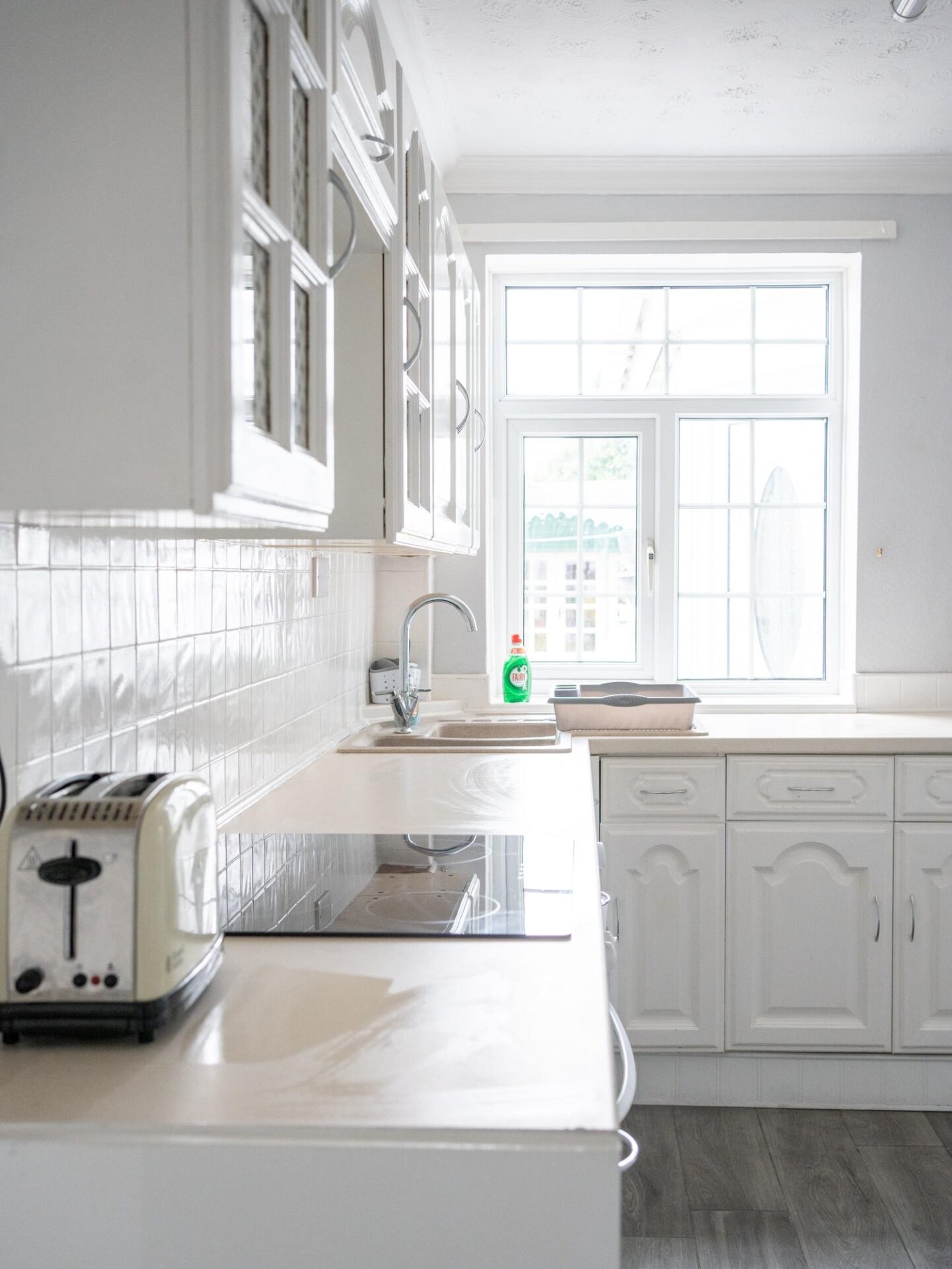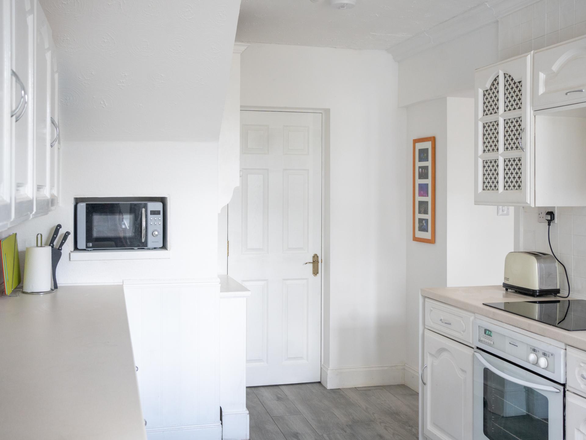 The large kitchen has lots of cupboards. Modern appliances include toaster, kettle, microwave, oven, electric hob, fridge and washing machine. A very good selection of kitchen cooking utensils, cutlery, pans, bowls, plates, cups, glasses is provided.