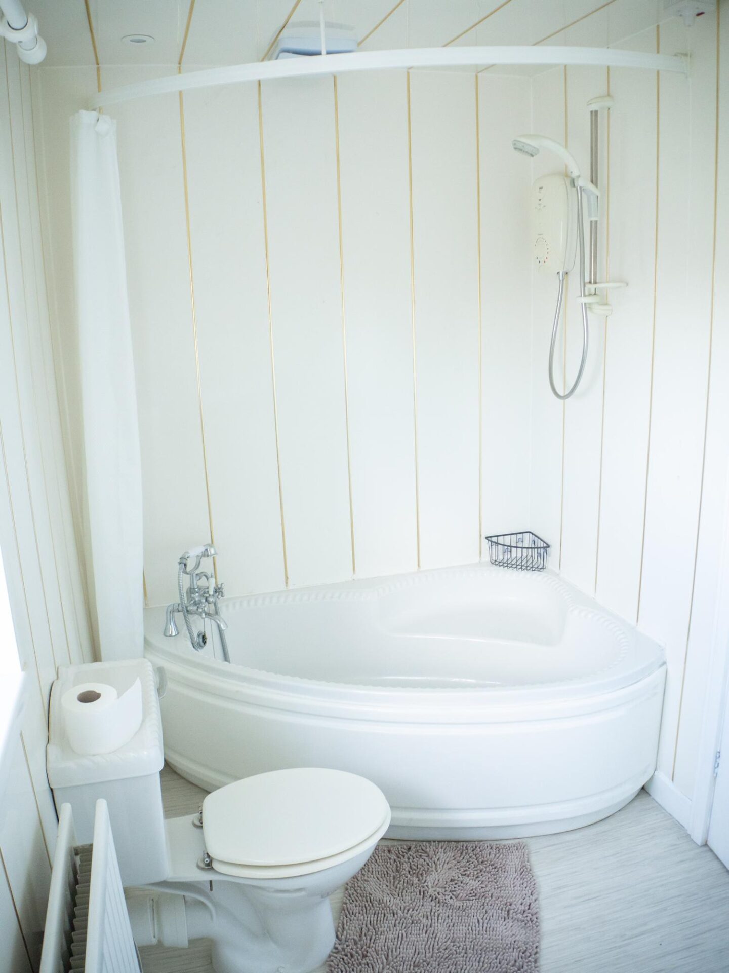 Modern bathroom suite with shower, corner bath, w.c and humidity controlled extractor. Extra w.c. downstairs.